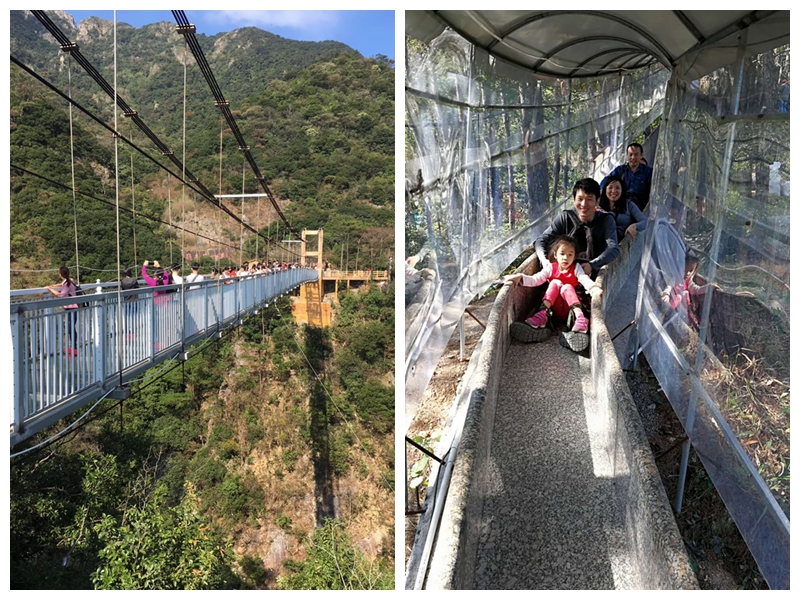 来到景区后,大家直奔“玻璃桥”挑战自我,穿过玻璃桥后还可以不走寻常下山路-体验飞龙滑道。